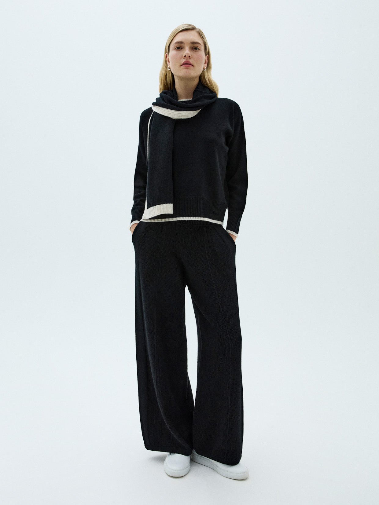 1 ply 100% cashmere, colour tipping detail on collar, cuff and skirt, drop shoulder, designed with a boxy fit. Deep rib details.
