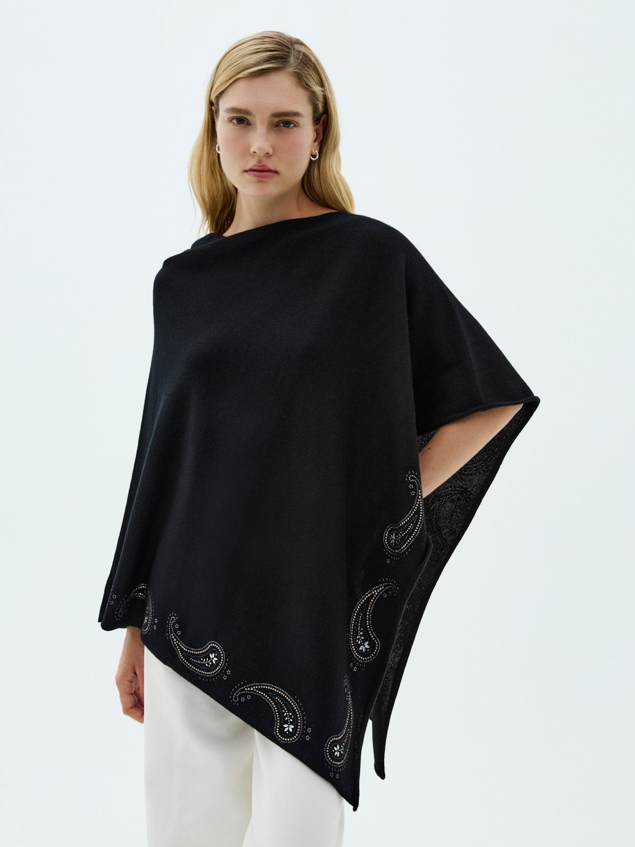 1 ply 100% cashmere poncho embellished with Swarovski® crystals with unique paisley crystal design on the border of the poncho front and back
