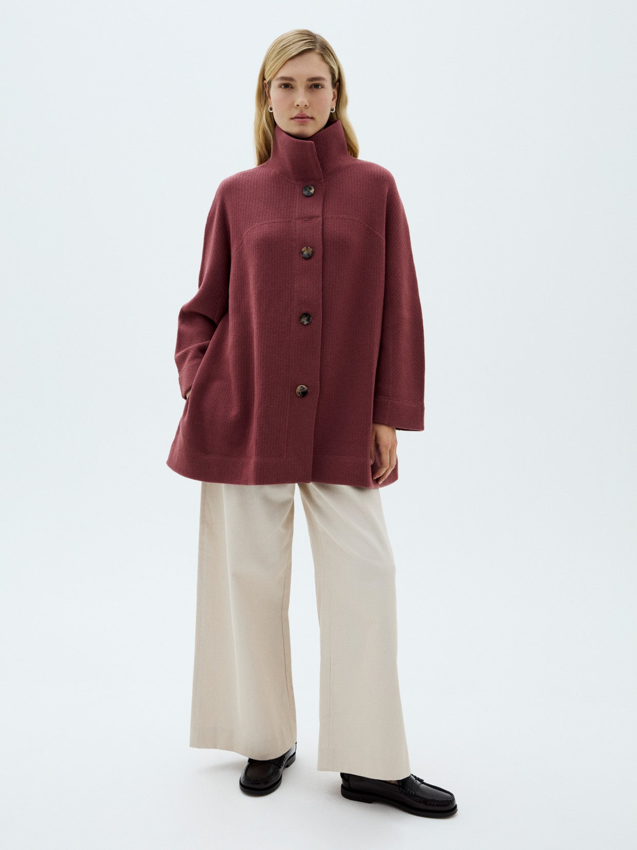 100% cashmere coat - heavy knitted jacquard fabric, designed with an oversize fit. Horn buttons. Hand made. Available in 2 sizes.  The model is 176cm / 5"8 and is wearing M/L