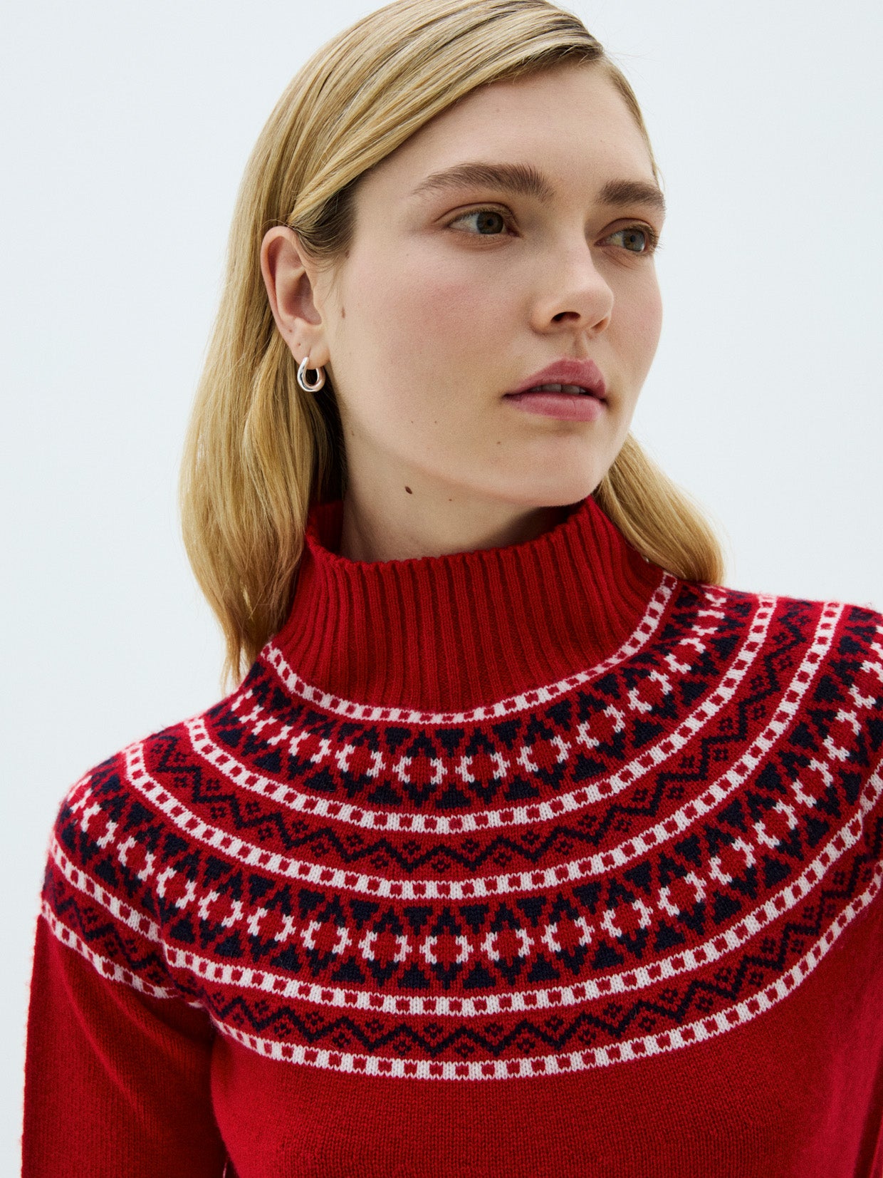 2 ply 100% cashmere turtle neck in 3 colours with unique Fair Isle detail across the shoulder. Designed with a classic fit.